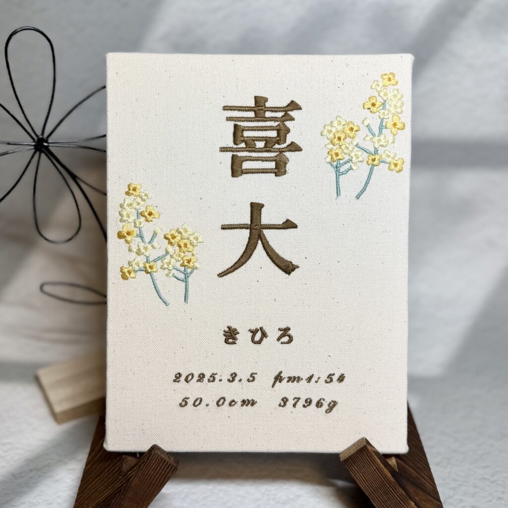 セミオーダー命名書《菜の花》 2025.12.03 喜大くん、素敵なオーダーありがとうございました♪ 目次 写真どんなオーダー内容?使用した糸色は? 写真 どんなオーダー内容? 右上と左下に菜の花 生成布 布仕立て足あり 使用した糸色は? 名前:茶色736番マット 菜の花:緑343番マット、黄色010番キラキラ、黄色812番キラキラ 由来刺繡布 ➔ 詳細ページ 発色を検索 ➔ color listタグから検索 ➔ タグ一覧