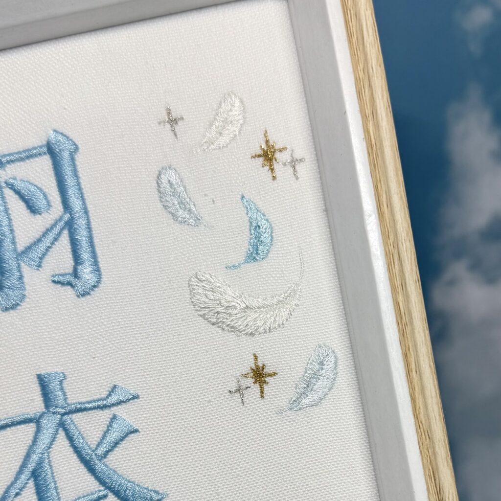 - 右上に羽とキラキラ、左下にハートで作った花束とキラキラ