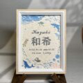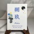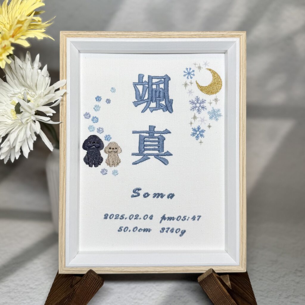 - 右上に三日月と雪の結晶とキラキラ、左下に愛犬のトイプードル2匹と足跡