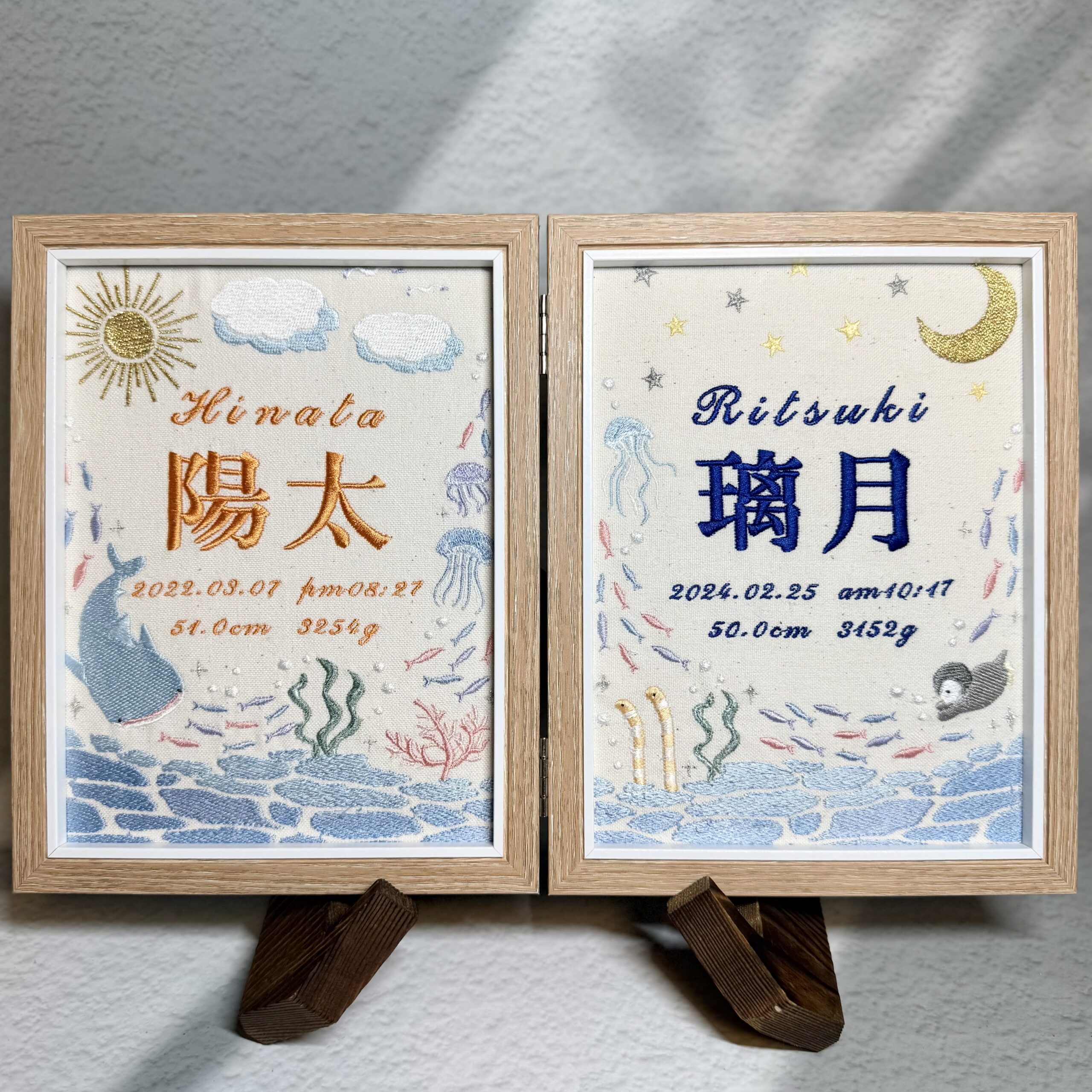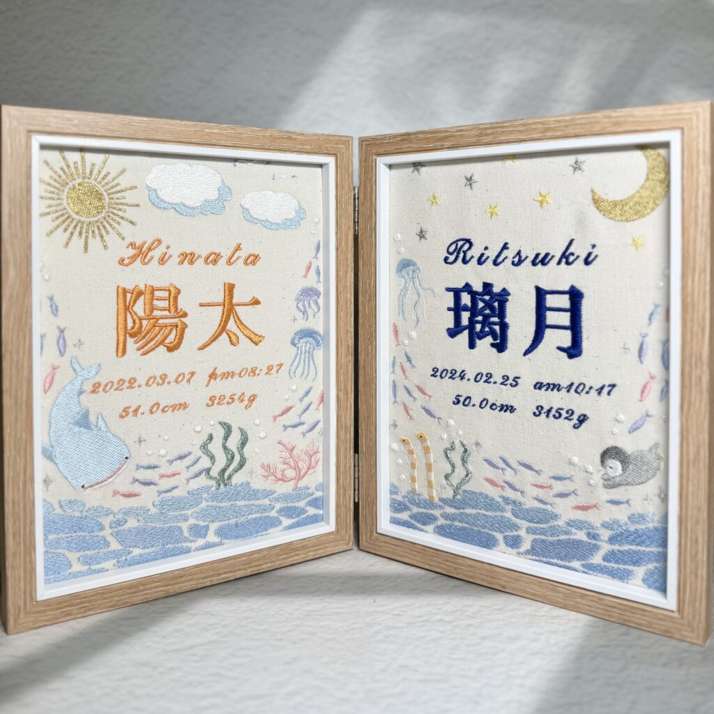 デザイン自由な命名書背面刺繍《兄弟で繋がる海デザイン》 2025.12.04 璃月くん、陽太くん、素敵なオーダーありがとうございました♪ 写真 璃月くん命名書 ➔ 詳細ページ 陽太くん命名書 ➔ 詳細ページ 発色を検索 ➔ color listタグから検索 ➔ タグ一覧
