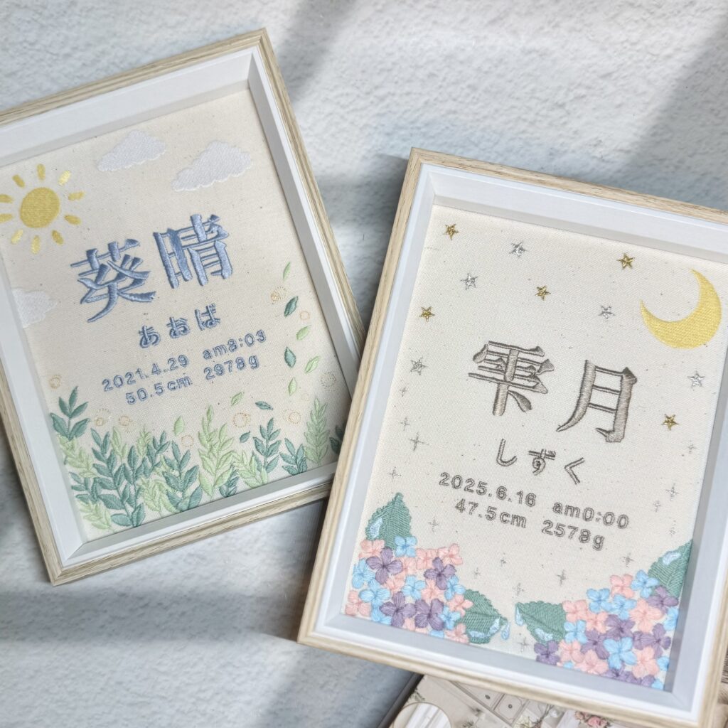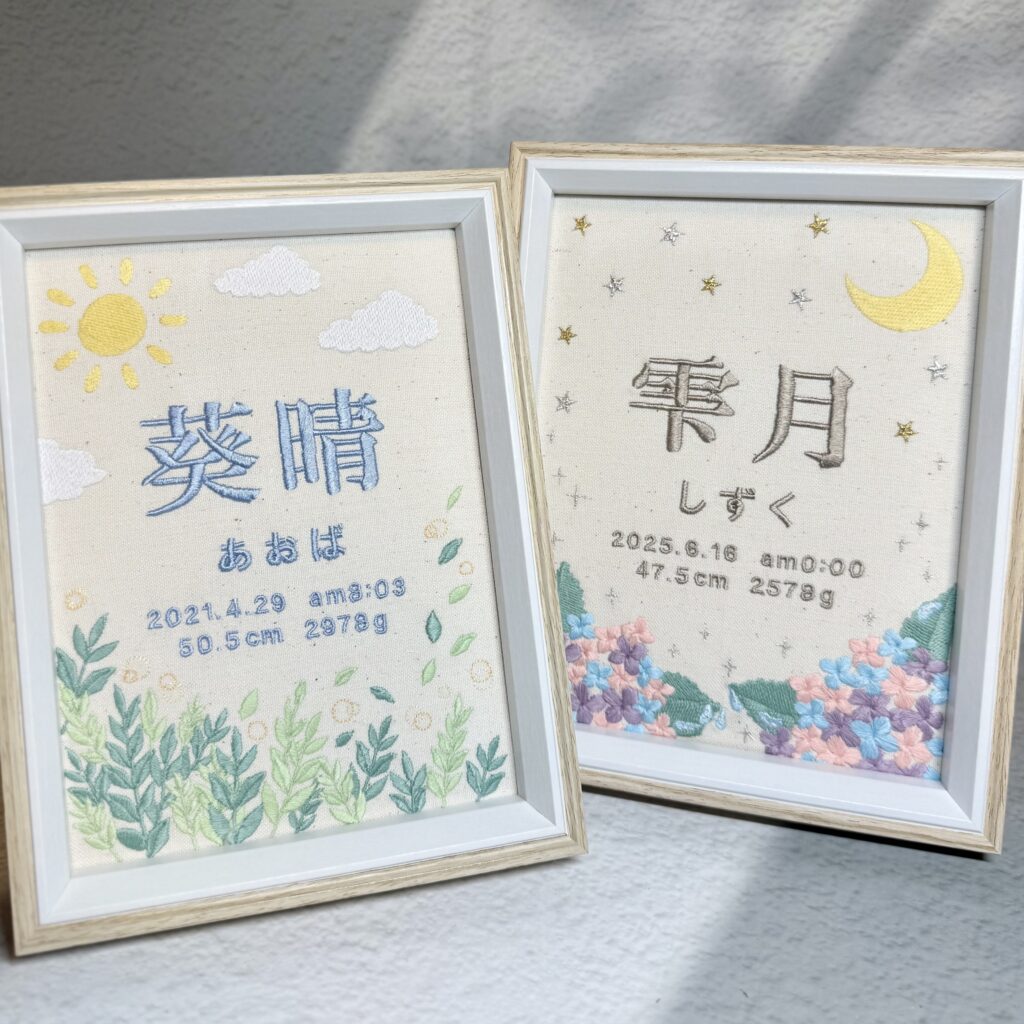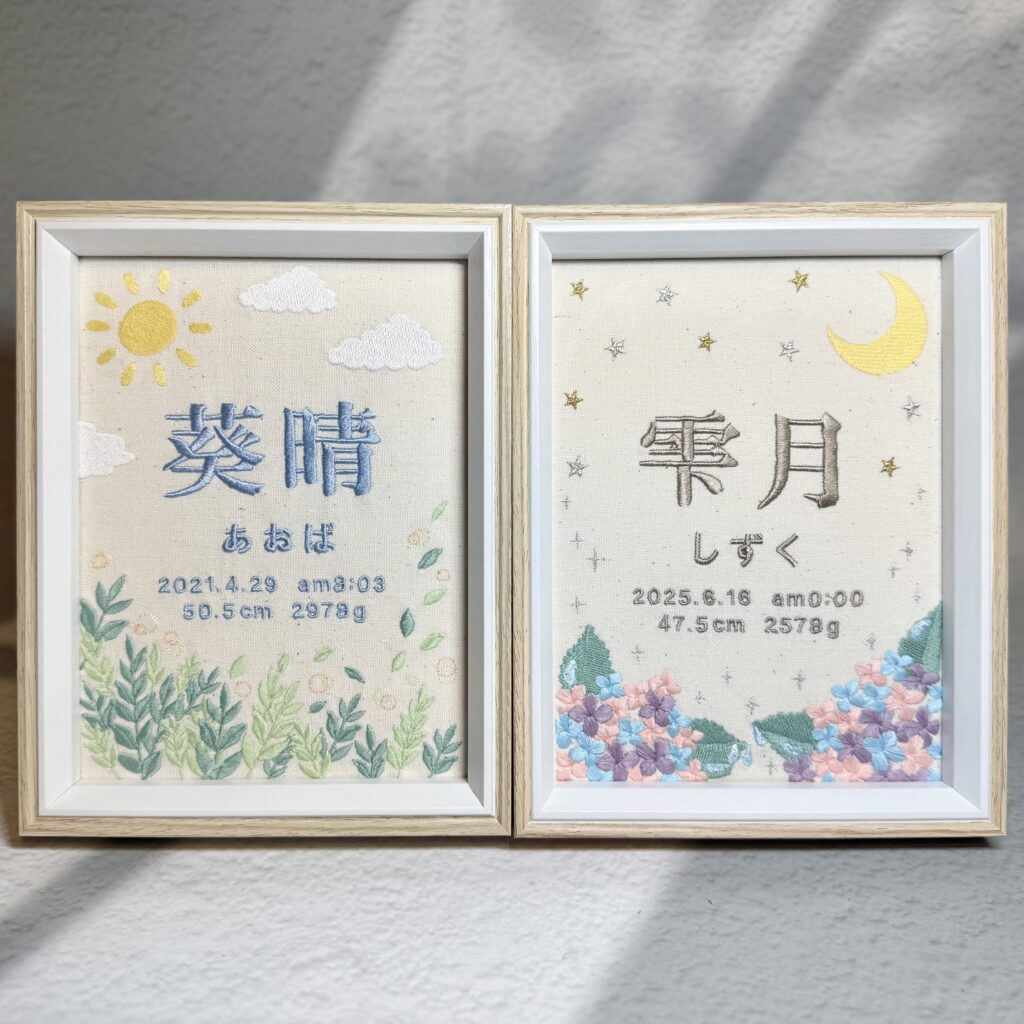 デザイン自由な命名書背面刺繍《きょうだいで紫陽花と新緑》 2026.01.11 雫月ちゃん、葵晴くん、素敵なオーダーありがとうございました♪ 写真 雫月ちゃん命名書 ➔ 詳細ページ 葵晴くん命名書 ➔ 詳細ページ