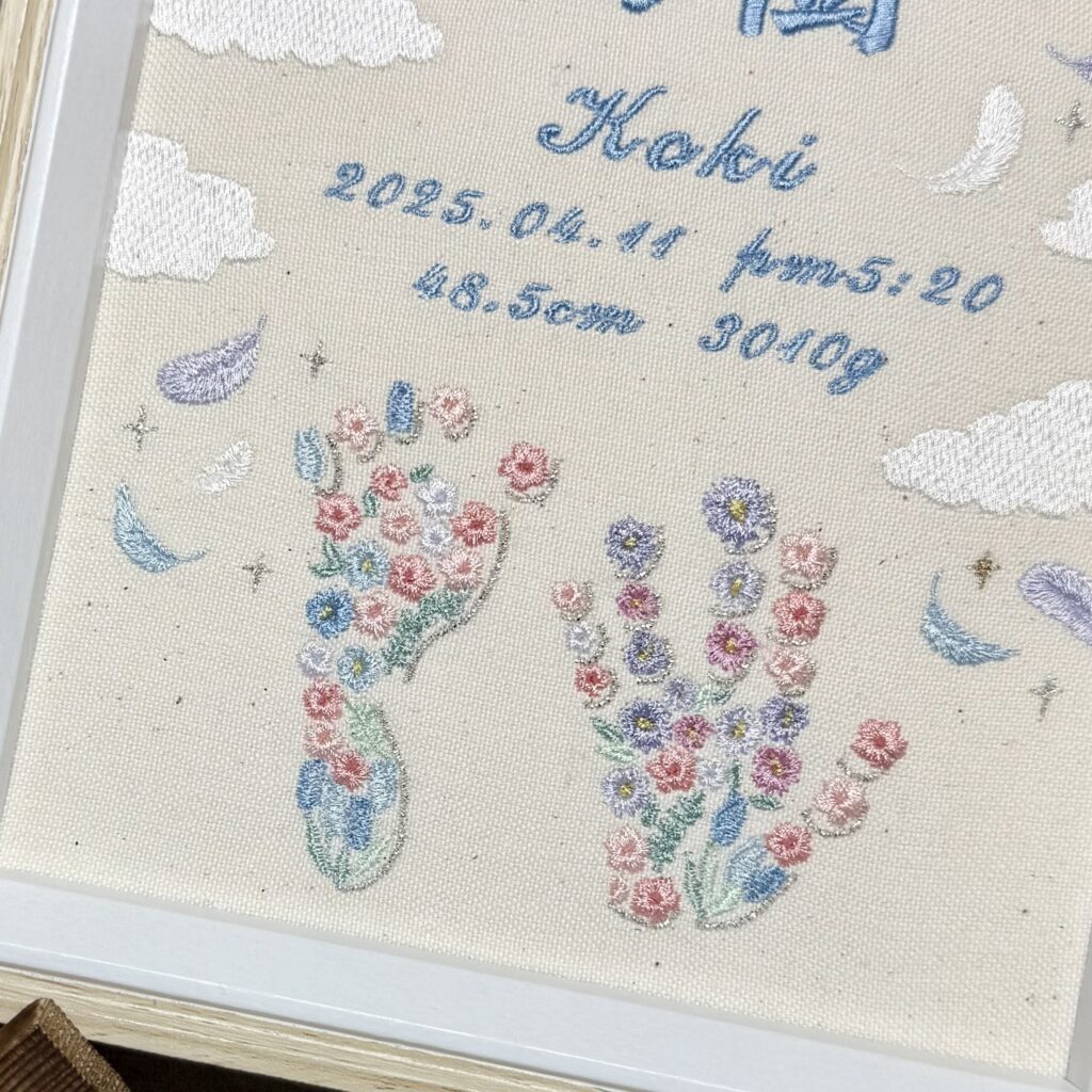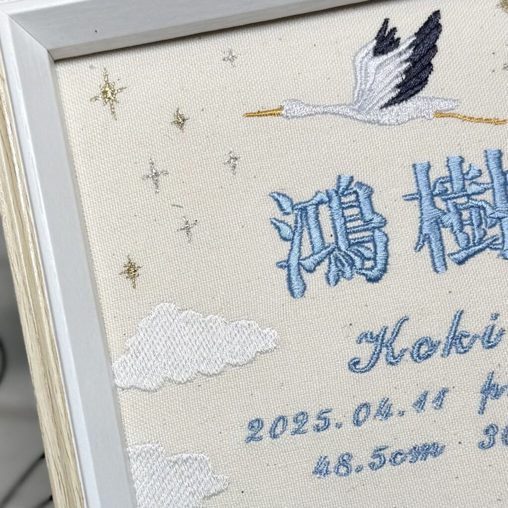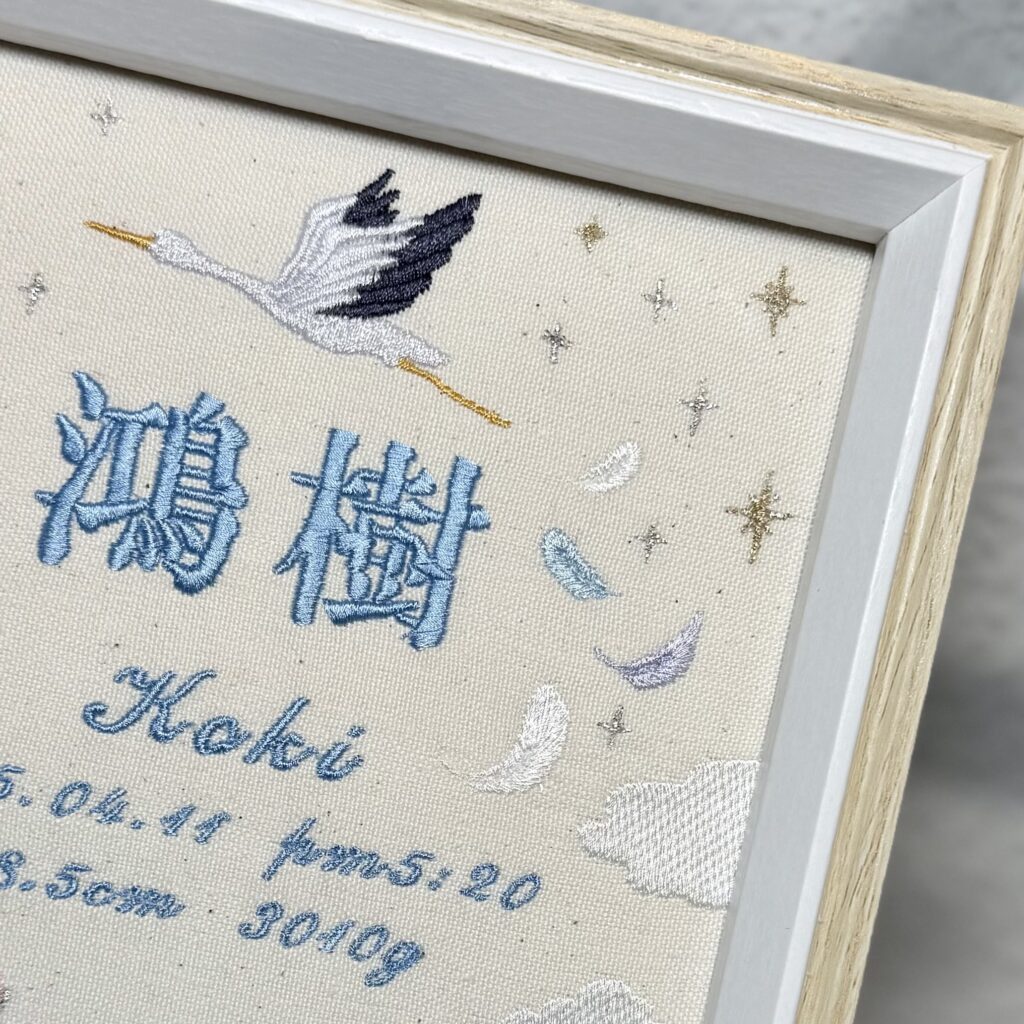 デザイン自由な命名書背面刺繡《幸せを運ぶコウノトリと手足形》