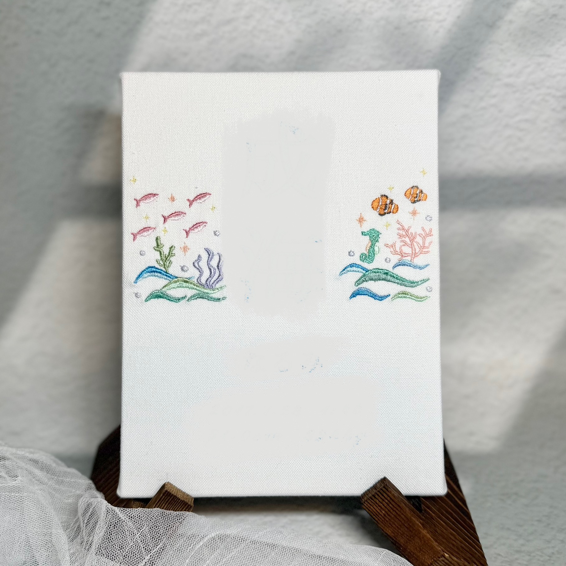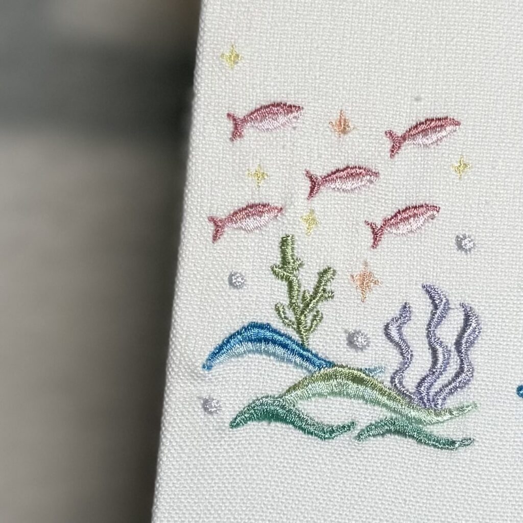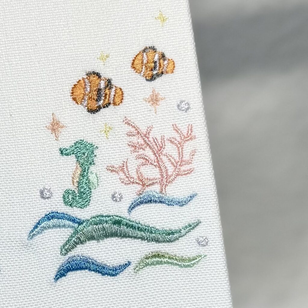 - デザイン:両サイドに繋がる海、タツノオトシゴ、小魚、珊瑚、ワカメ