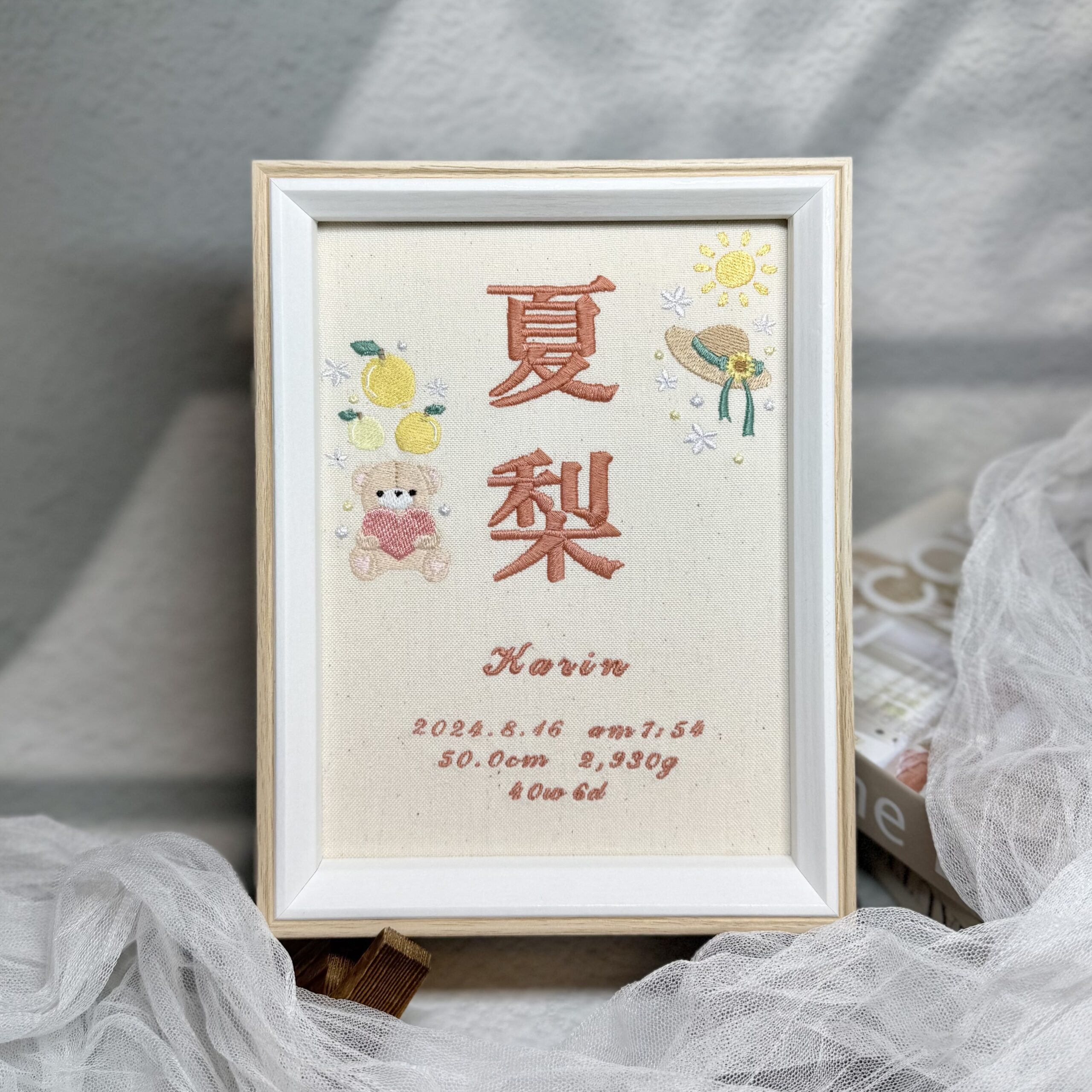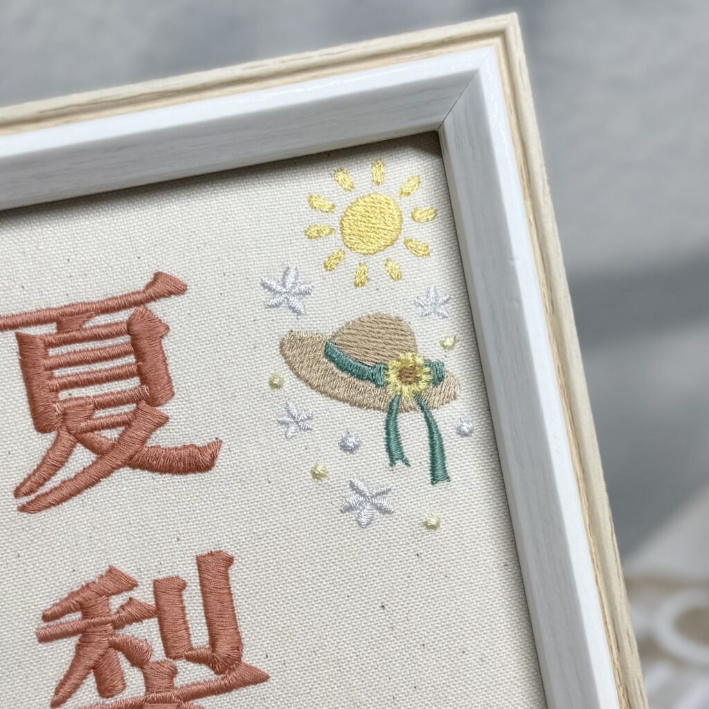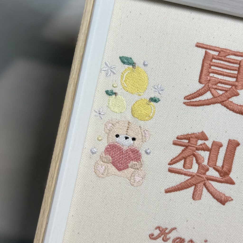 - デザイン:右上は麦わら帽子や太陽で夏っぽく、左下にテディベアと梨とハートでおまかせ