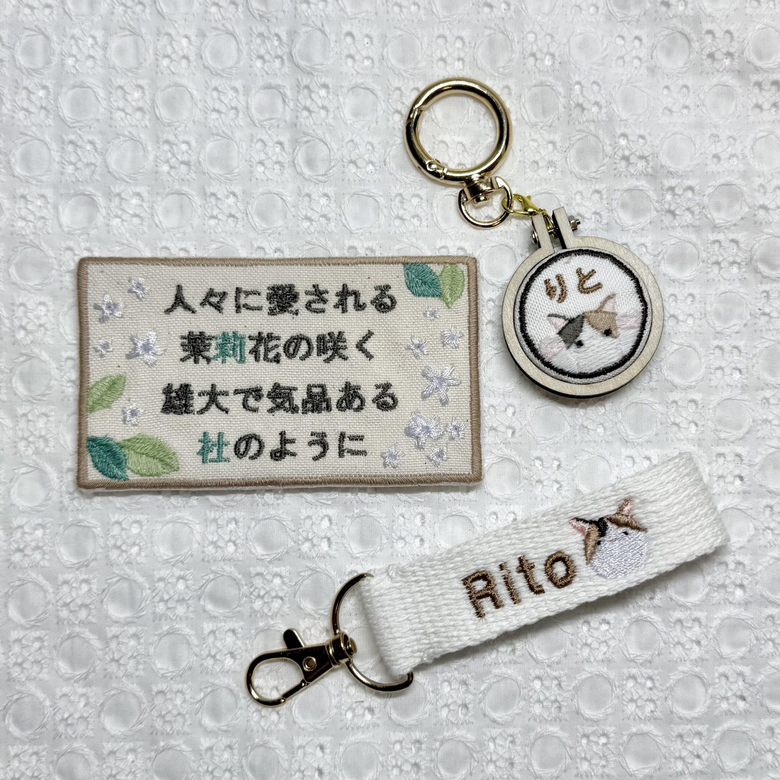 デザインできるネームタグ《飼い猫》 2026.01.16 りとくん、素敵なオーダーありがとうございました♪ 目次 写真オーダー内容と、使用した糸色は? 写真 オーダー内容と、使用した糸色は? Rito メニュー:ネームタグ▶︎飼い猫 布の色:ホワイト 名前の色:茶色323番キラキラ 飼い猫:茶色058番キラキラ、茶色719番キラキラ 発色を検索 ➔ color listタグから検索 ➔ タグ一覧