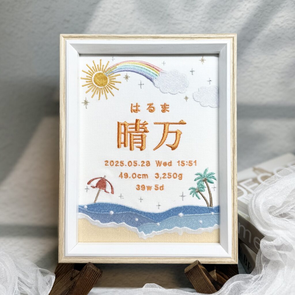 デザイン自由な命名書一面刺繍《綺麗な海とパラソル》