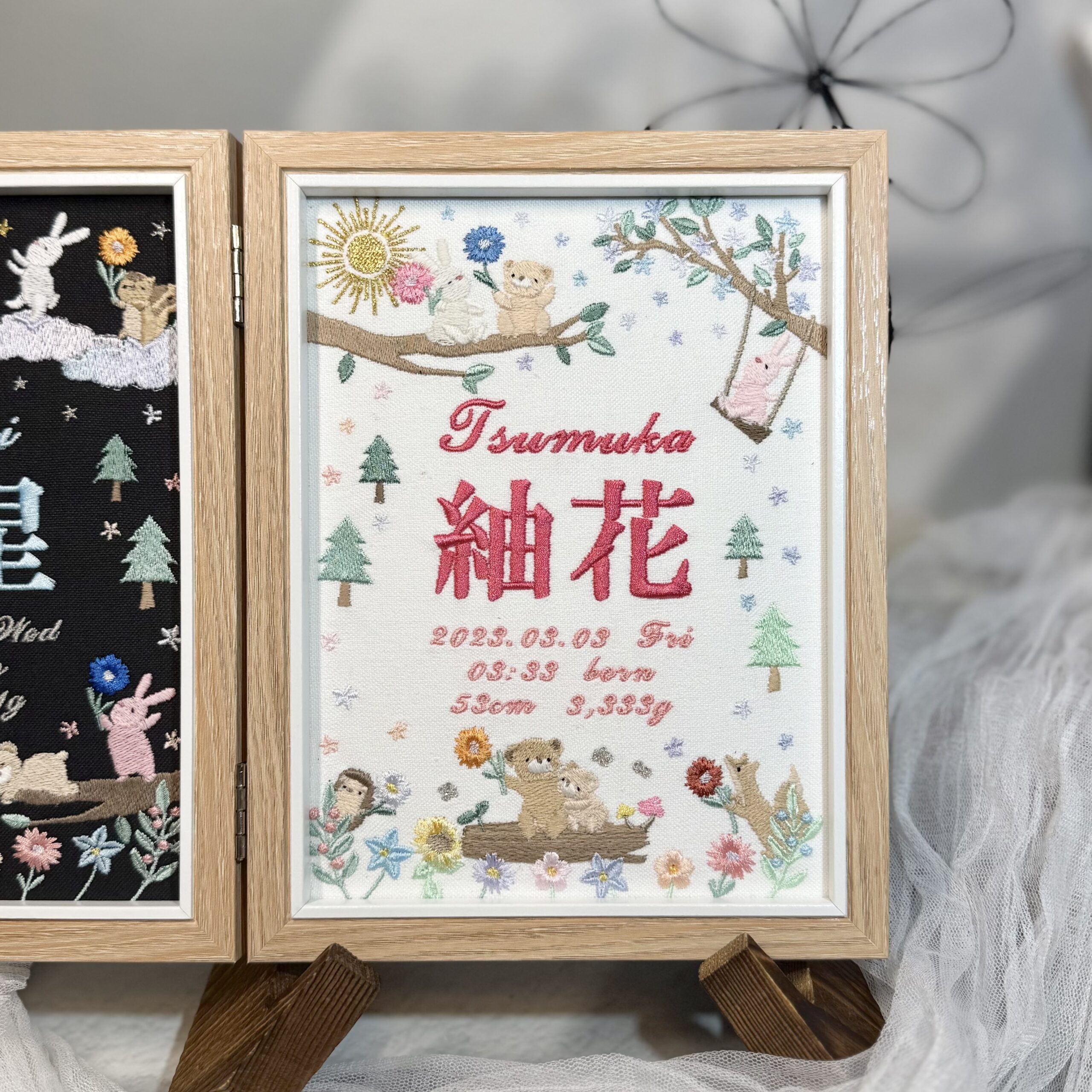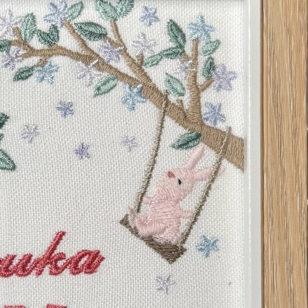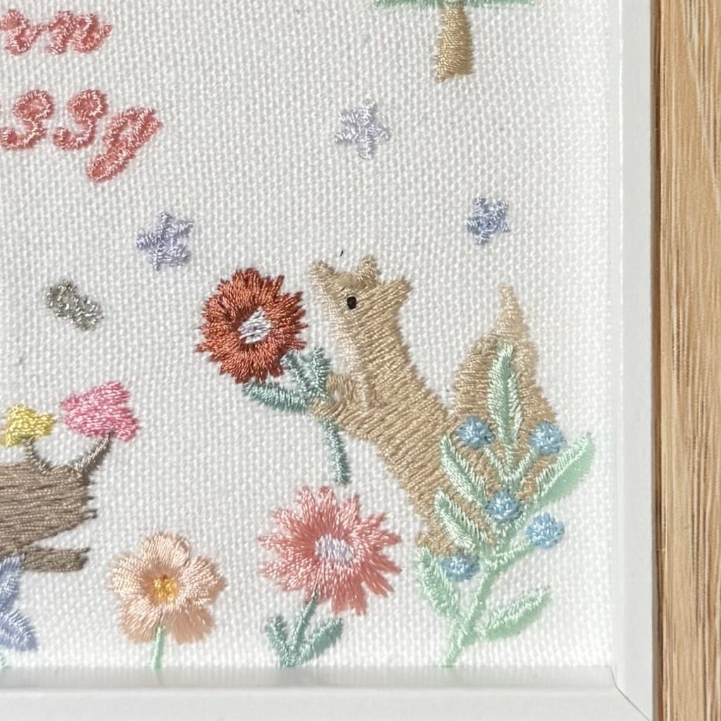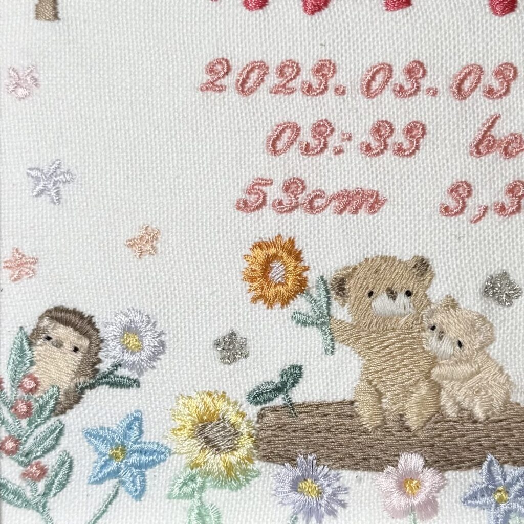 固定デザイン命名書《光の森と動物たち ~ガーベラに託す想い~デザイン》 2026.01.17 紬花ちゃん、素敵なオーダーありがとうございました♪ 目次 写真どんなオーダー内容?糸色? 写真 どんなオーダー内容?糸色? メニュー:固定デザイン命名書 デザイン:光の森と動物たち ~ガーベラに託す想い~デザイン 仕立て:額縁仕立て 布色:ホワイト布 名前:ピンク086番キラキラ ロゴ:ピンク079番キラキラ 発色を検索 ➔ color listタグから検索 ➔ タグ一覧