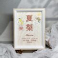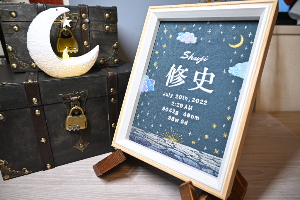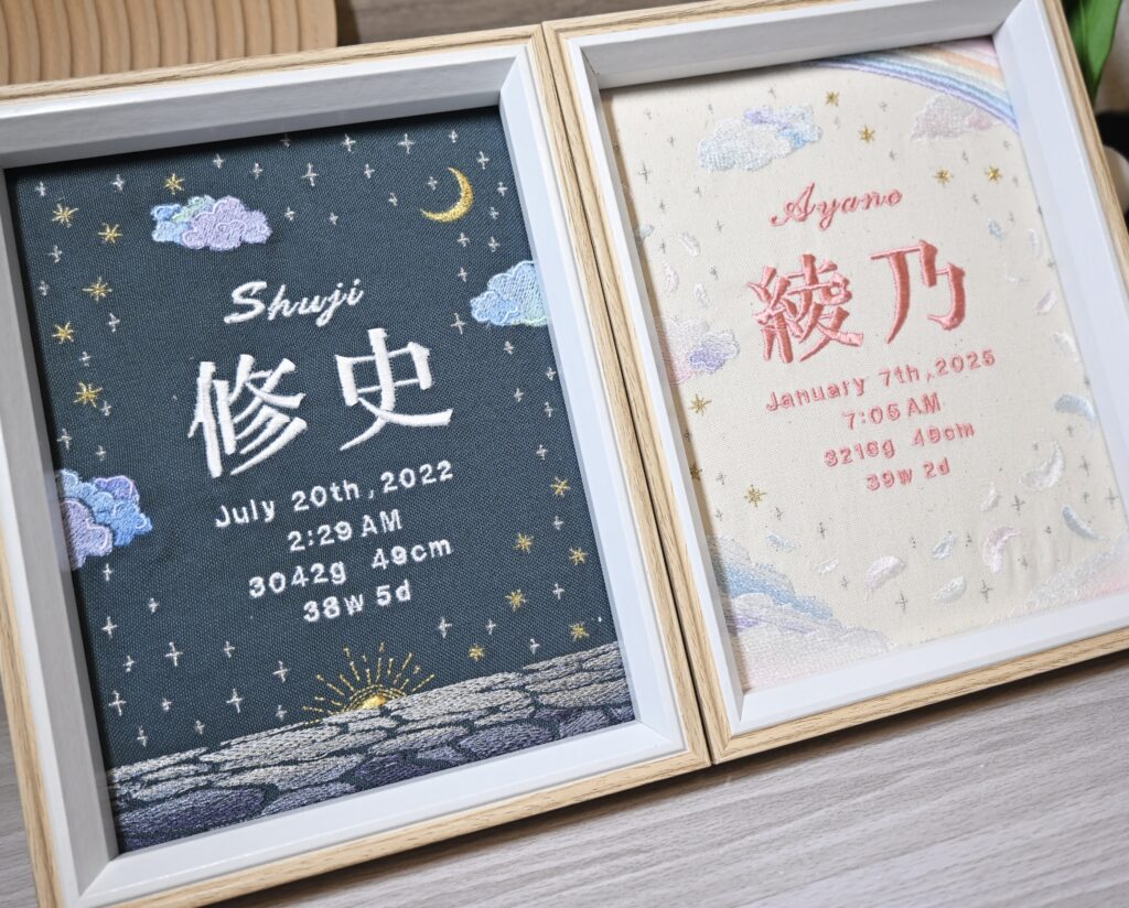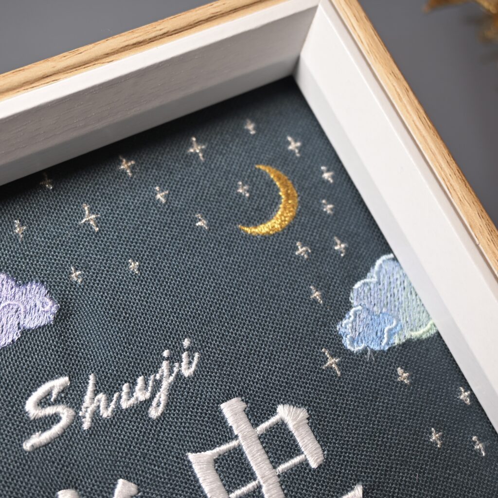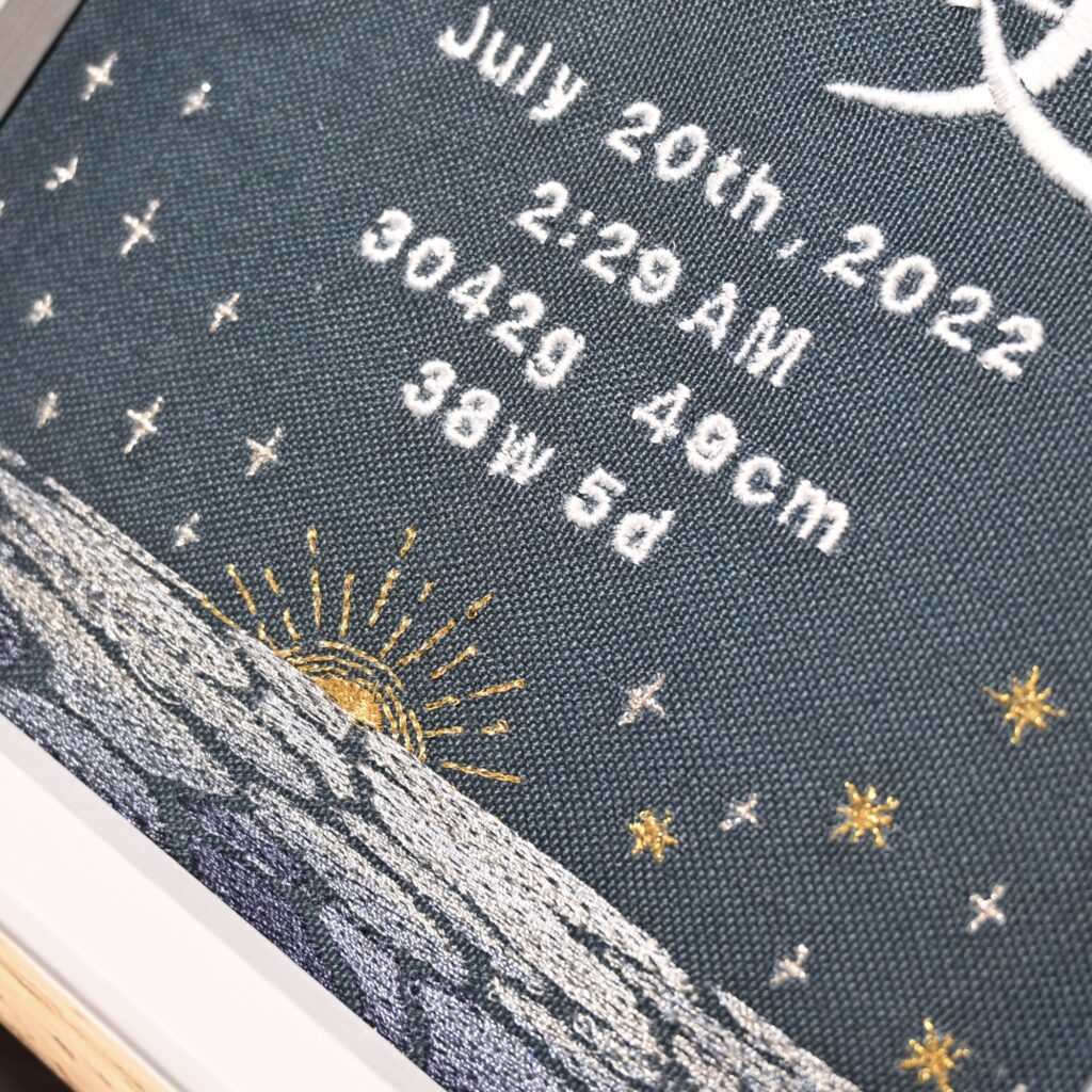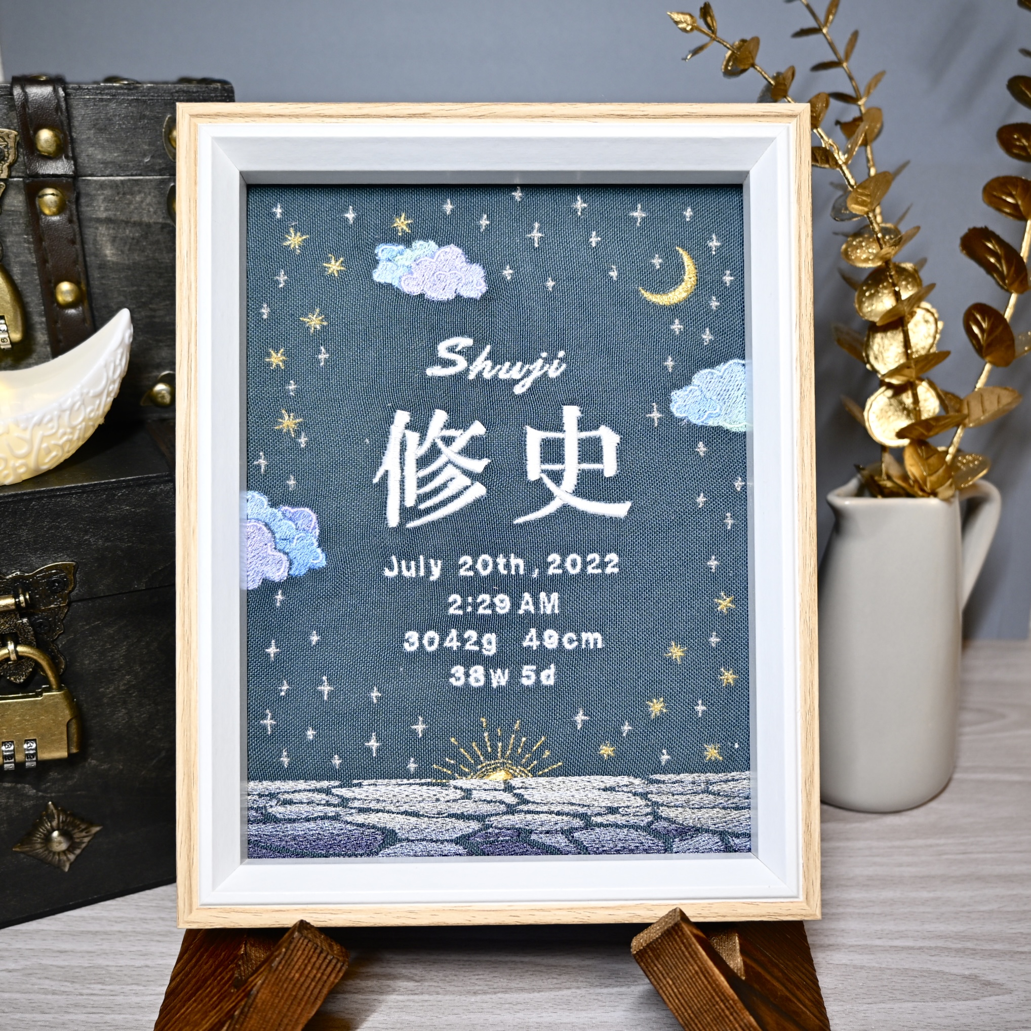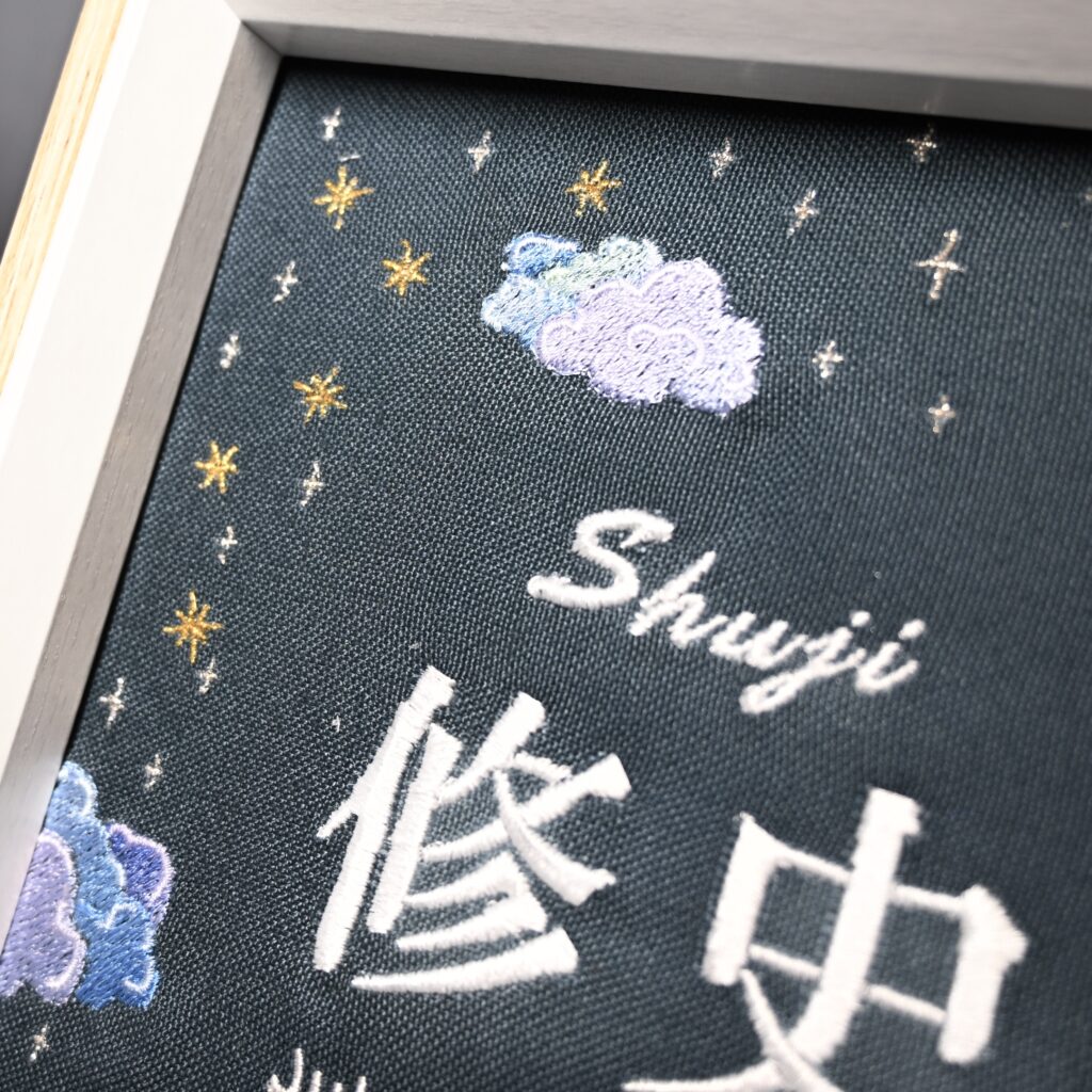 固定デザイン命名書《夜明けのはじまりデザイン》 2026.01.17 修史くん、素敵なオーダーありがとうございました♪ 目次 写真どんなオーダー内容?糸色? 写真 どんなオーダー内容?糸色? メニュー:固定デザイン命名書 デザイン:夜明けのはじまりデザイン 仕立て:額縁仕立て 布色:くすみブルー布 名前:白キラキラ 発色を検索 ➔ color listタグから検索 ➔ タグ一覧