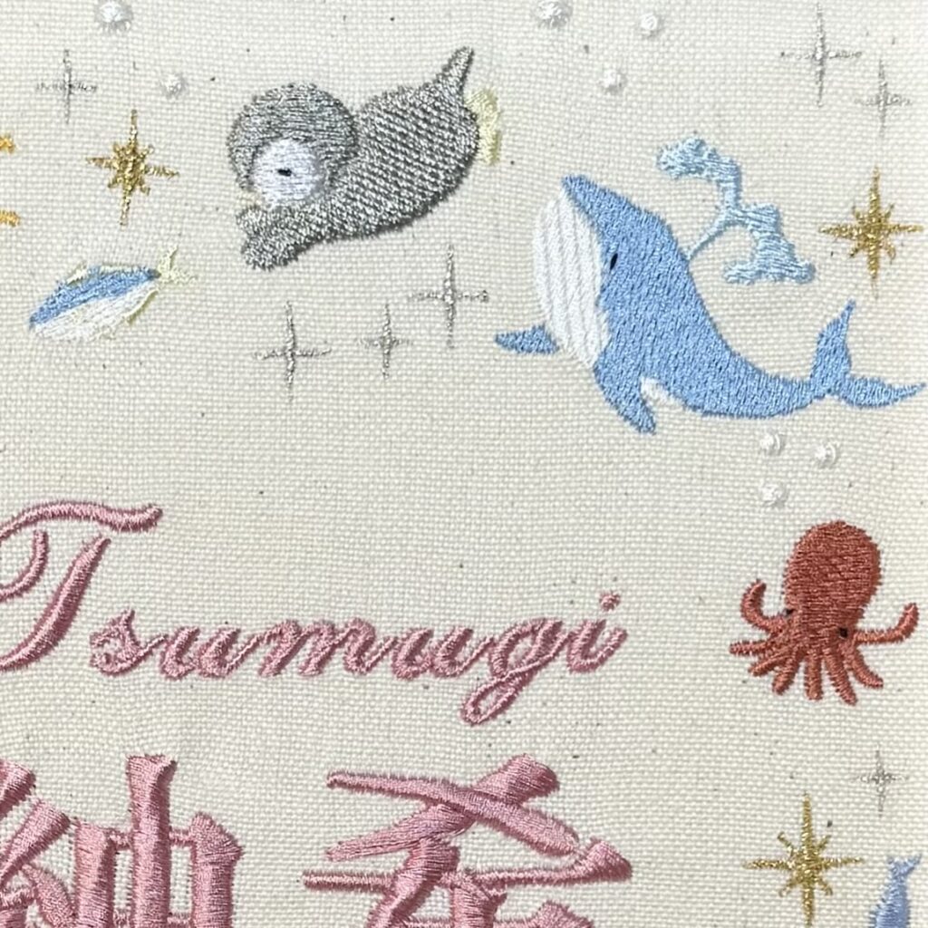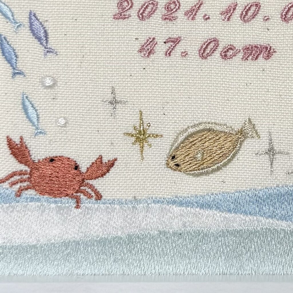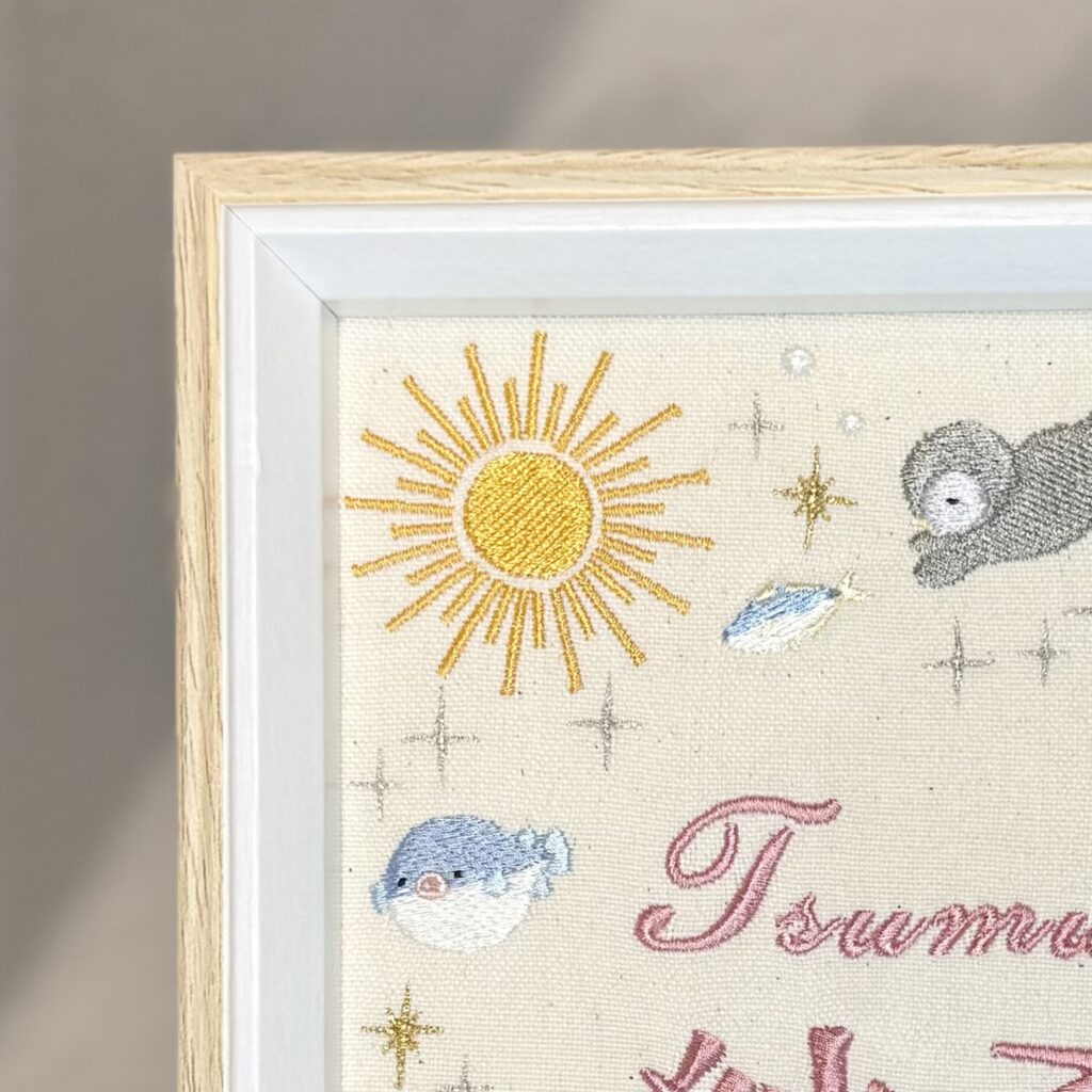 固定デザイン命名書《昼の海デザイン》 2026.01.17 紬希ちゃん、素敵なオーダーありがとうございました♪ 目次 写真どんなオーダー内容?糸色? 写真 どんなオーダー内容?糸色? メニュー:固定デザイン命名書 デザイン:昼の海デザイン 仕立て:額縁仕立て 布色:生成布 名前:ピンク6番キラキラ 発色を検索 ➔ color listタグから検索 ➔ タグ一覧