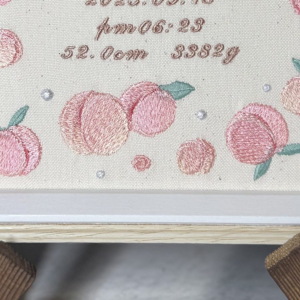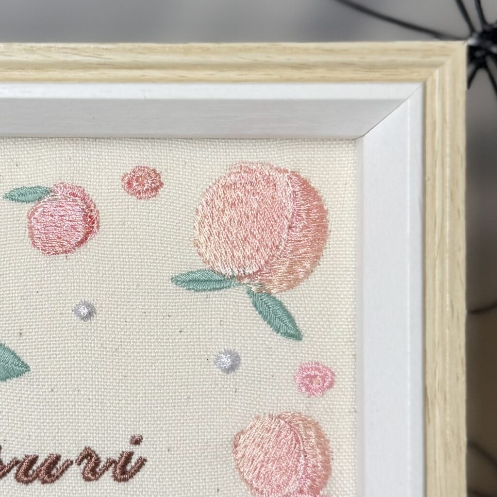 固定デザイン命名書《桃の祝福デザイン》 2026.01.17 夏莉ちゃん、素敵なオーダーありがとうございました♪ 目次 写真どんなオーダー内容?糸色? 写真 どんなオーダー内容?糸色? メニュー:固定デザイン命名書 デザイン:桃の祝福デザイン 仕立て:額縁仕立て 布色:生成布 名前:ピンクブラウン333番キラキラ ロゴ:ピンクベージュ326番キラキラ 発色を検索 ➔ color listタグから検索 ➔ タグ一覧