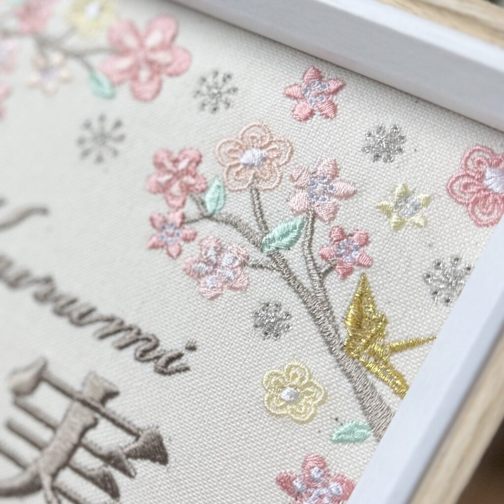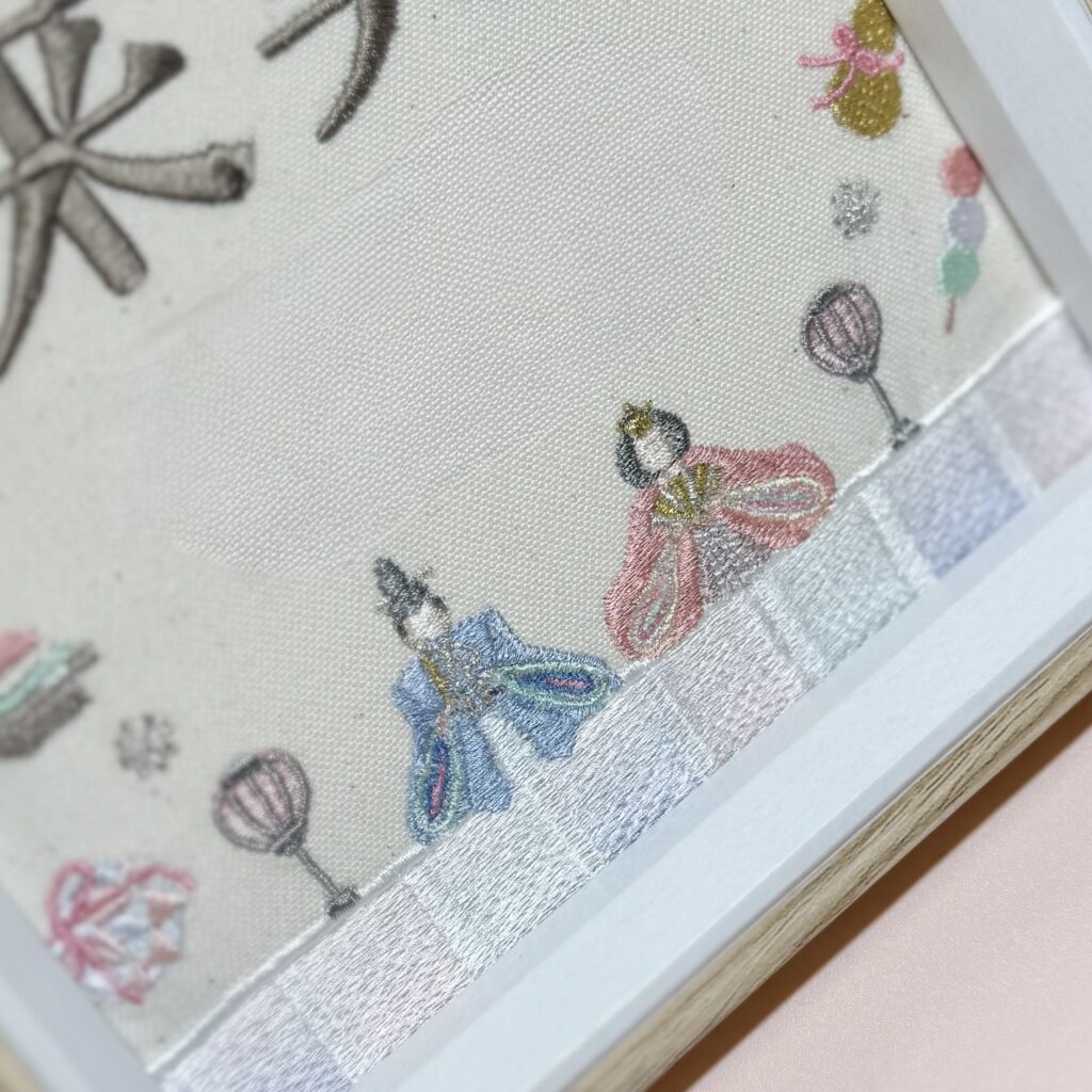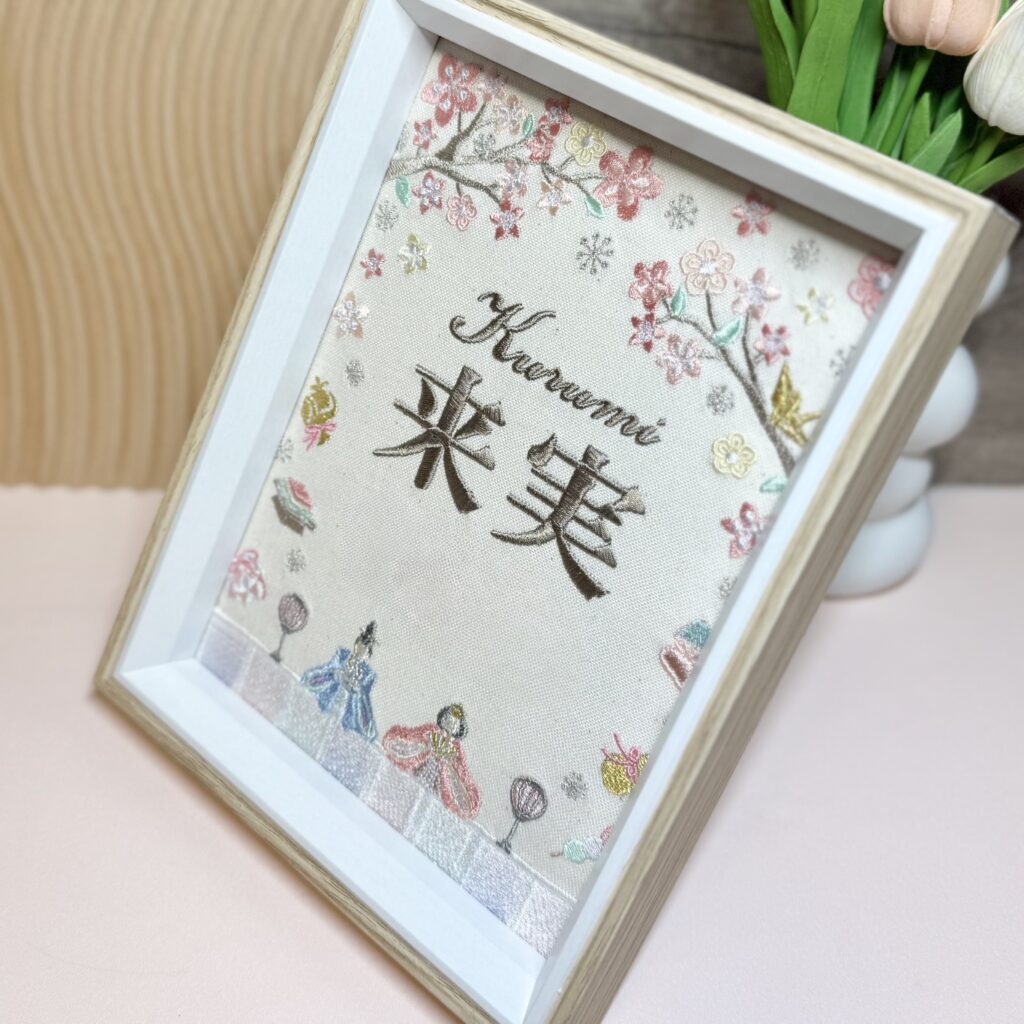 固定デザイン命名書《桃の節句~ひな日和~デザイン》 2026.01.17 来実ちゃん、素敵なオーダーありがとうございました♪ 目次 写真どんなオーダー内容?糸色? 写真 どんなオーダー内容?糸色? メニュー:固定デザイン命名書 デザイン:桃の節句~ひな日和~ 仕立て:額縁仕立て 布色:生成布 名前:茶色716番キラキラ 発色を検索 ➔ color listタグから検索 ➔ タグ一覧