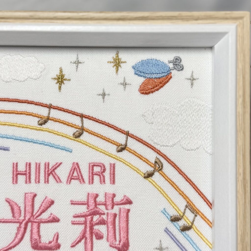 固定デザイン命名書《音楽デザイン》 2026.01.17 光莉ちゃん、素敵なオーダーありがとうございました♪ 目次 写真どんなオーダー内容?糸色? 写真 どんなオーダー内容?糸色? メニュー:固定デザイン命名書 デザイン:音楽デザイン 仕立て:額縁仕立て 布色:ホワイト布 名前:ピンク085番キラキラ 発色を検索 ➔ color listタグから検索 ➔ タグ一覧