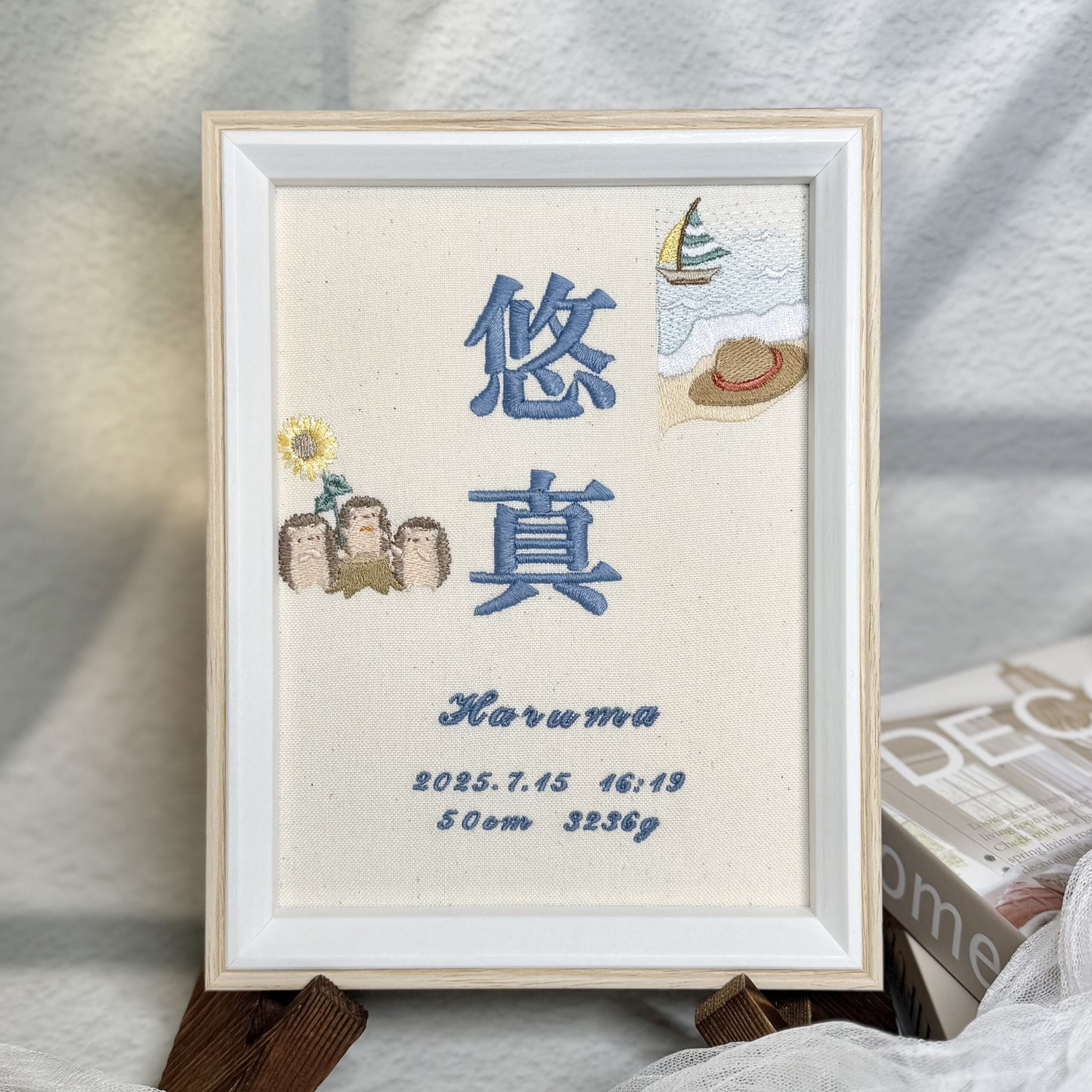 オリジナル命名書複雑デザイン《親子ハリネズミと麦わら帽子》