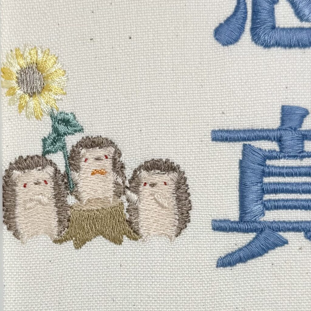 • デザイン:右上に麦わら帽子とヨット、左下にハリネズミの親子(赤目)