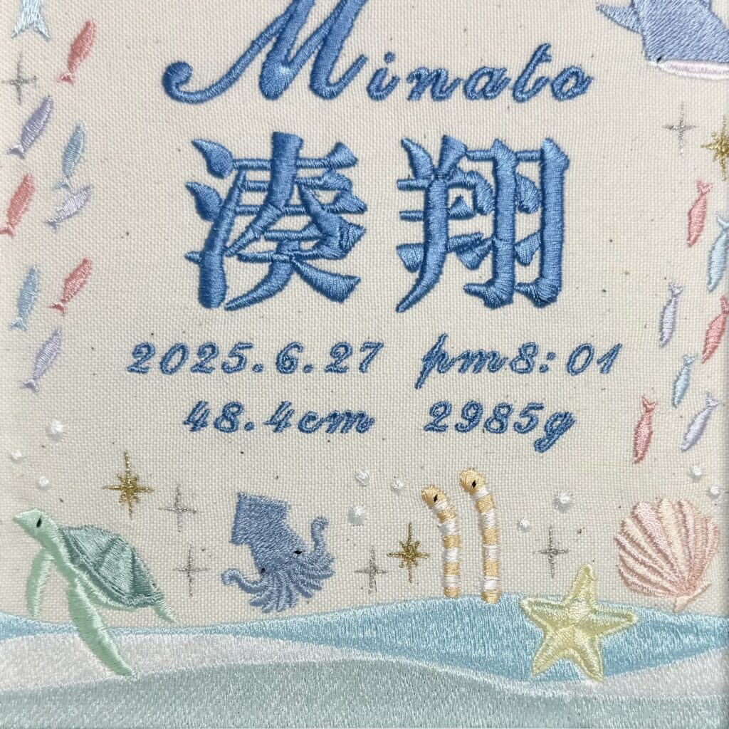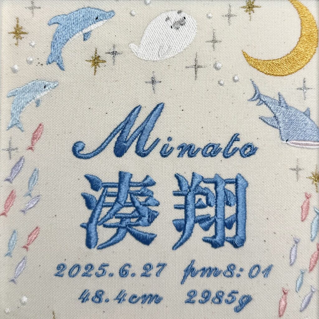 固定デザイン命名書《夜の海デザイン》 2026.01.20 湊翔くん、素敵なオーダーありがとうございました♪ 目次 写真どんなオーダー内容?糸色? 写真 どんなオーダー内容?糸色? メニュー:固定デザイン命名書 デザイン:夜の海海デザイン 仕立て:額縁仕立て 布色:生成布 名前:青74番キラキラ 発色を検索 ➔ color listタグから検索 ➔ タグ一覧