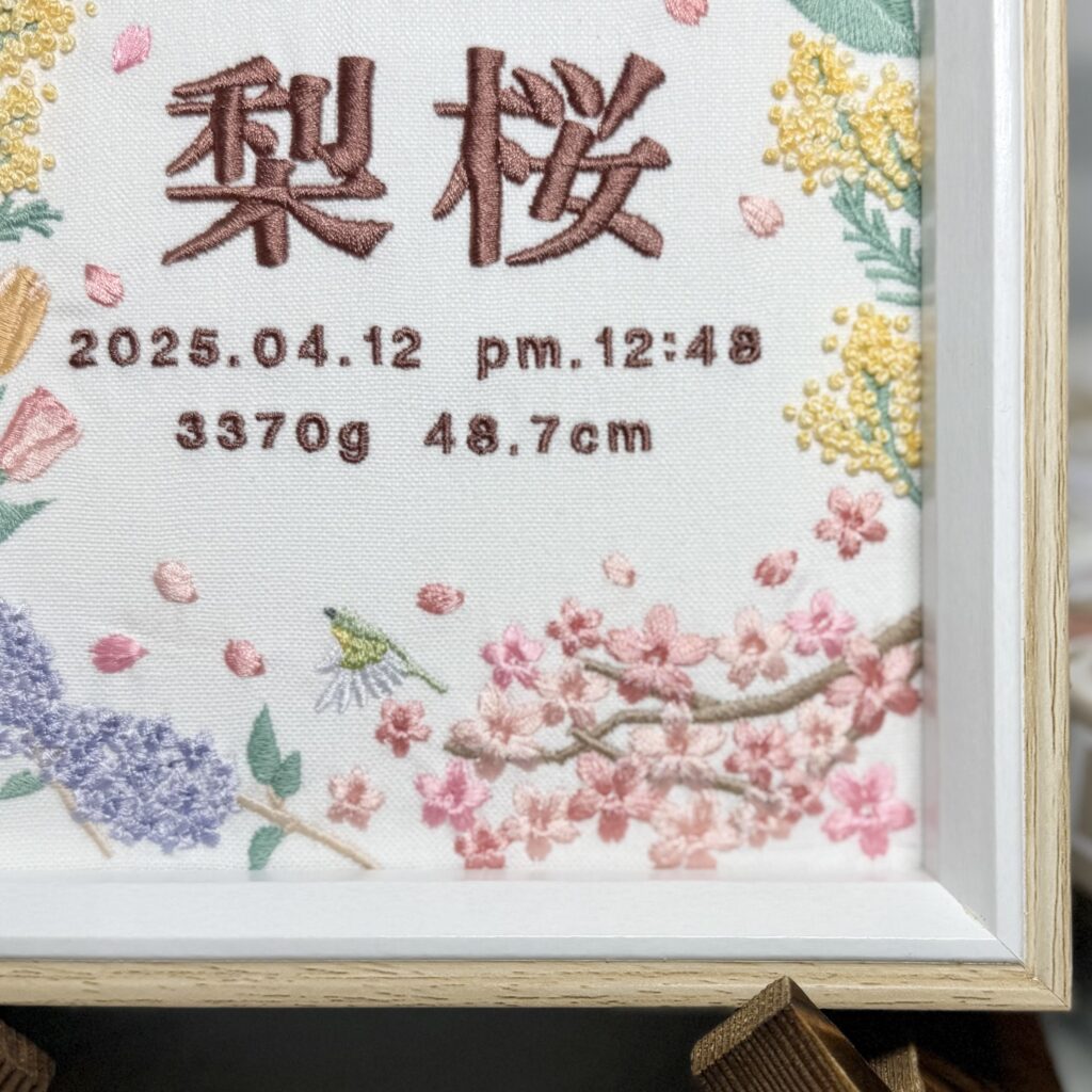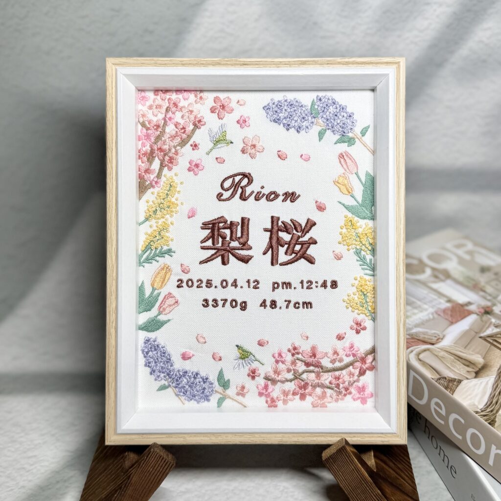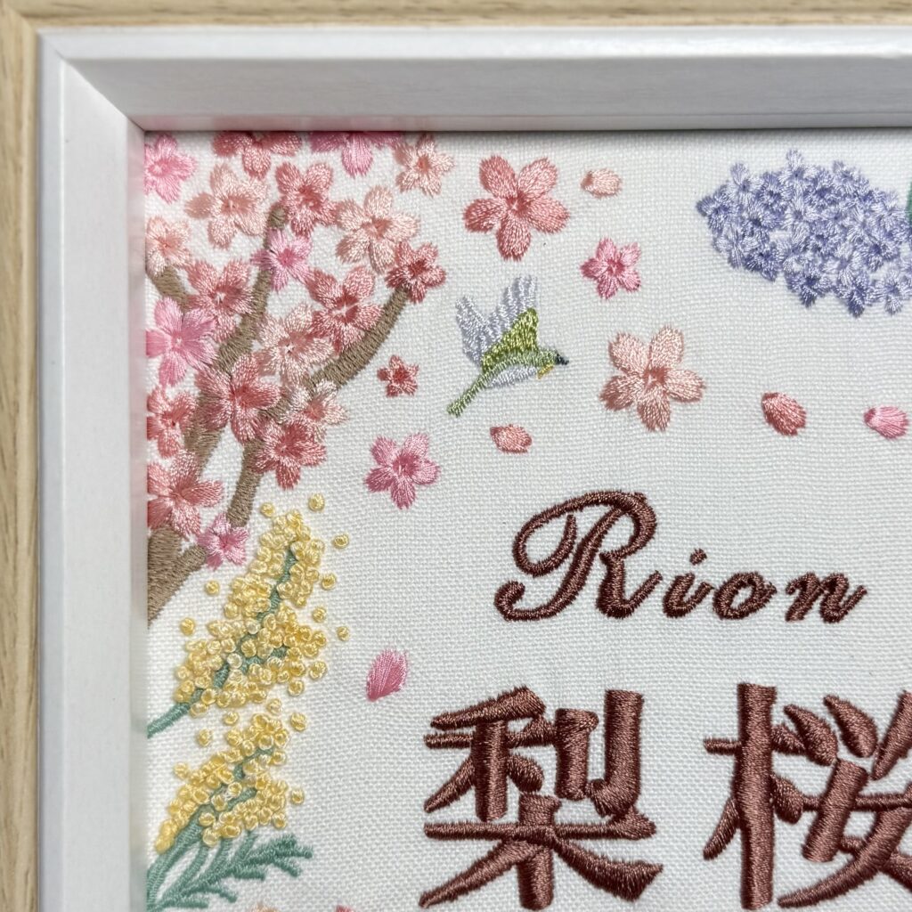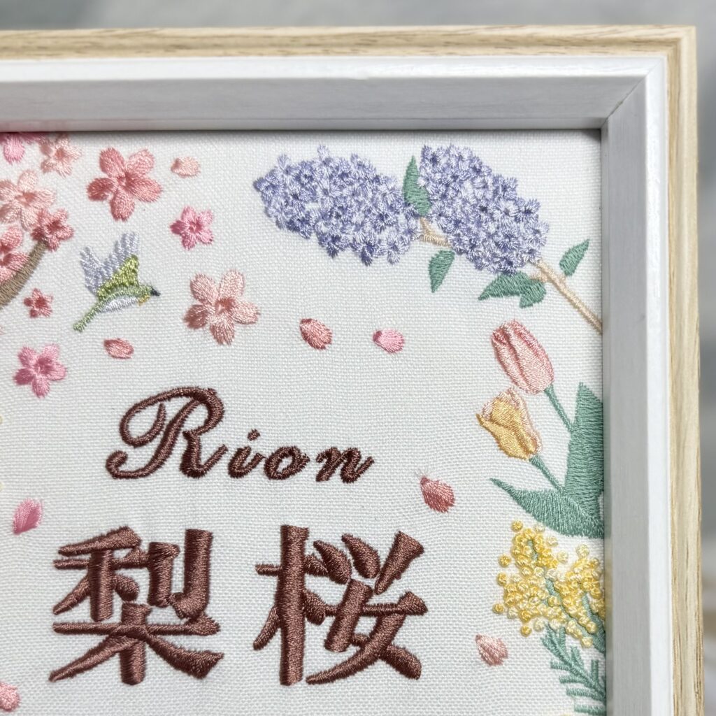 デザイン自由な命名書背面刺繍《お花に囲まれたデザイン》