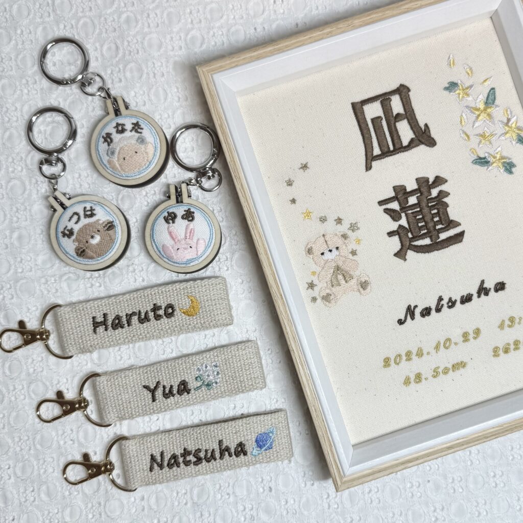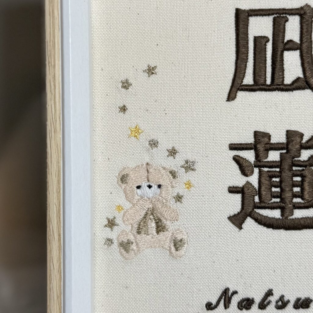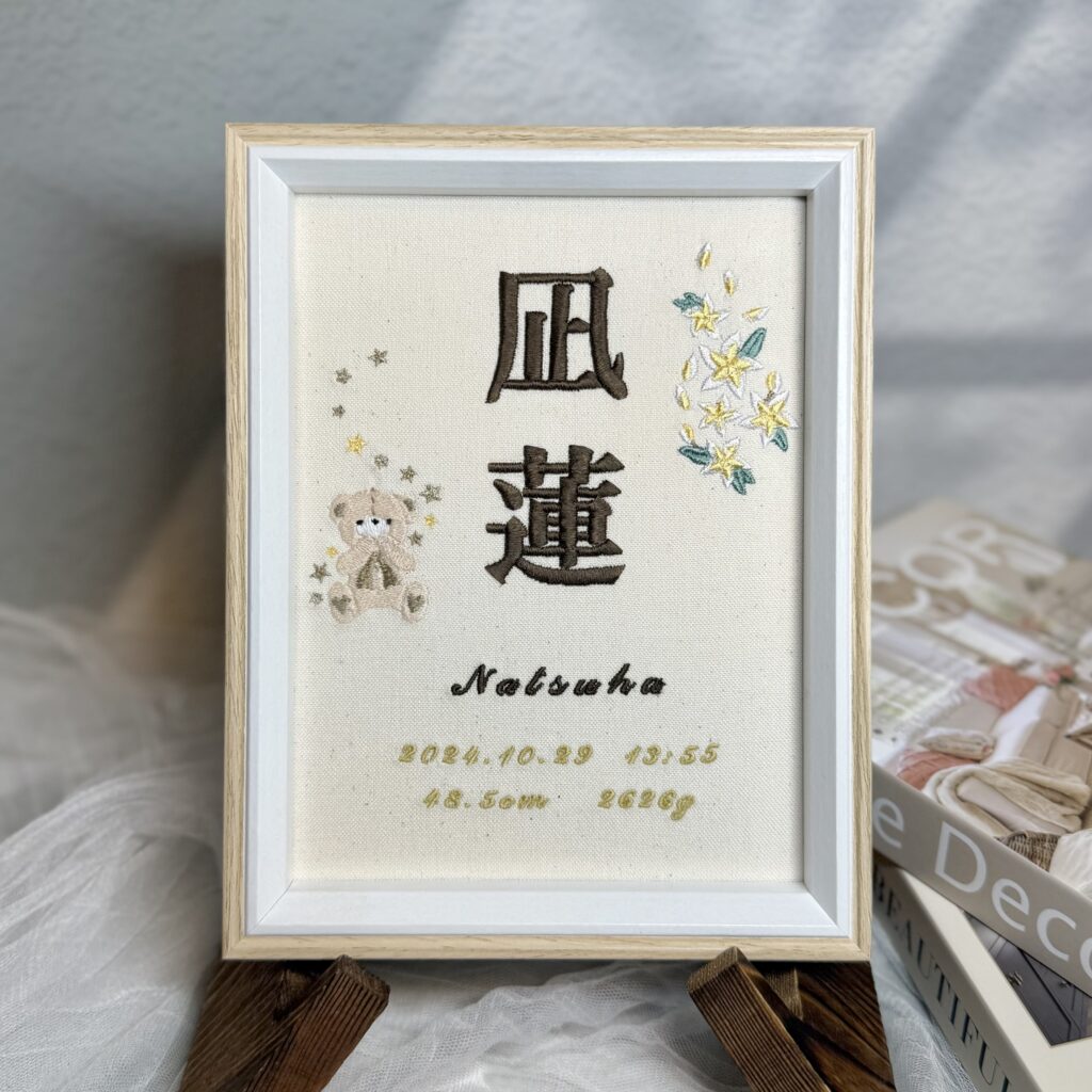 セミオーダー命名書《テディベアとプルメリア》カスタム可能 出産記念 刺繡命名書 デザインが選べる命名書