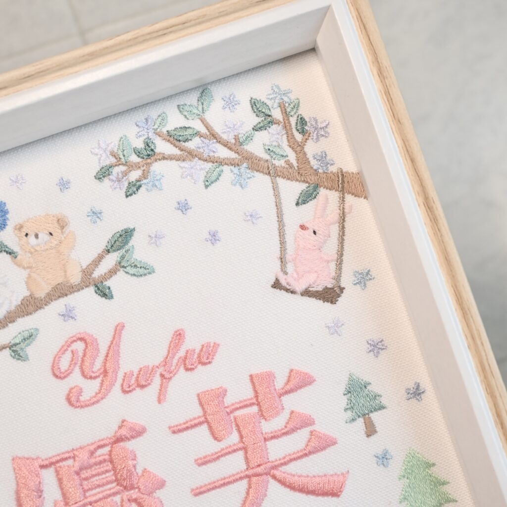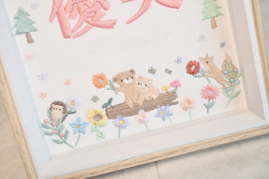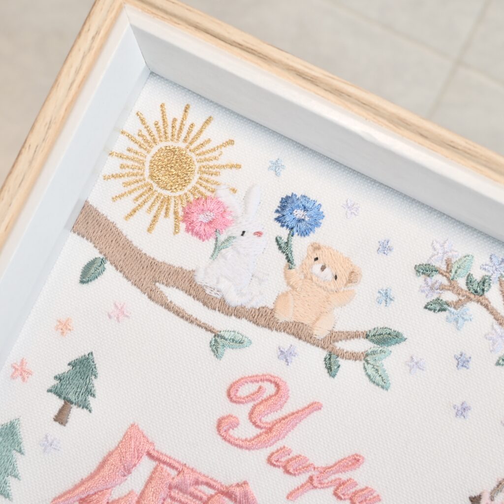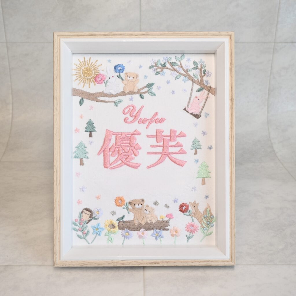 固定デザイン命名書《光の森と動物たち》 2026.03.272026.03.28 優芙ちゃん、素敵なオーダーありがとうございました♪ 目次 写真どんなオーダー内容?糸色? 写真 どんなオーダー内容?糸色? メニュー:固定デザイン命名書 デザイン:光の森と動物たち 仕立て:額縁仕立て 布色:ホワイト布 名前:ピンク079番キラキラ ネームタグ ➔ 詳細ページ 発色を検索 ➔ color listタグから検索 ➔ タグ一覧