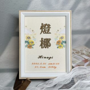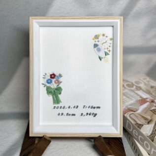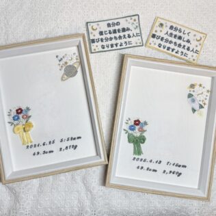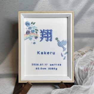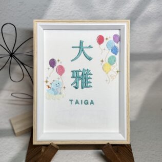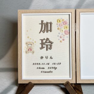 加玲ちゃん、素敵なオーダーありがとうございました♪写真どんなオーダー内容?メニュー:セミオーダー命名書デザイン:左下にテディベアと星、右上にガーベラ仕立て:額縁ダブル仕立て布色:生成布使用した糸色は?名前:ベージュ112番マットテディベア:...