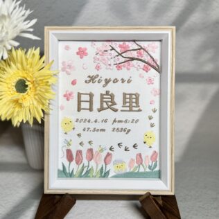 デザイン自由な命名書 -背面刺繍デザイン- デザイン自由な命名書《チューリップ畑で遊ぶひよこちゃん・桜の木》