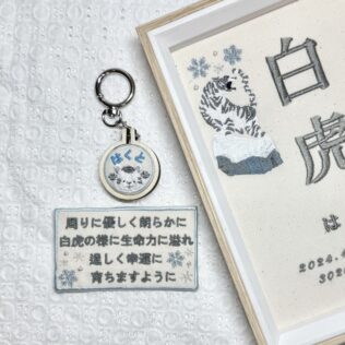 白虎くん、素敵なオーダーありがとうございました♪写真どんなオーダー内容?メニュー:オリジナル命名書複雑デザインデザイン:左右にかっこいいホワイトタイガー仕立て:額縁仕立て布色:生成布使用した糸色は?名前:グレー817番キラキラ雪:メタリック...