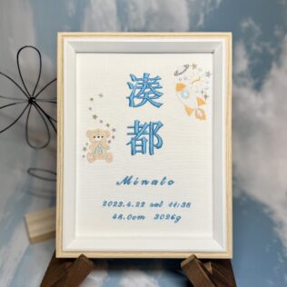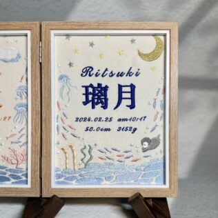 璃月くん、素敵なオーダーありがとうございました♪写真どんなオーダー内容?右上に月、下部は海デザインでおまかせ兄弟で繋がる命名書にしてほしい生成布額縁ダブル仕立て使用した糸色は?名前:青007番(キラキラ糸)月︰金色星︰グレー005番、黄色0...