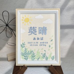 楓くん、素敵なオーダーありがとうございました♪写真オーダー内容と、使用した糸色は?メニュー:デザイン自由な命名書一面刺繍デザイン:上部に太陽と楓、下部に愛犬と楓仕立て:額縁仕立て布色:生成布使用した糸色は?名前:水色206番キラキラロゴ:ベ...