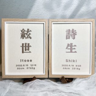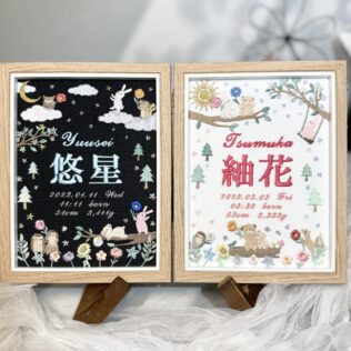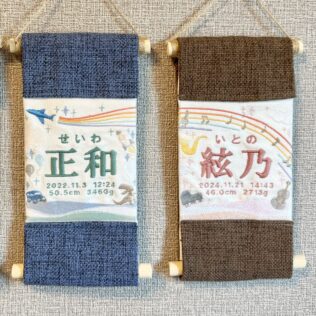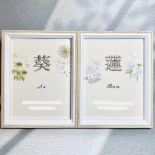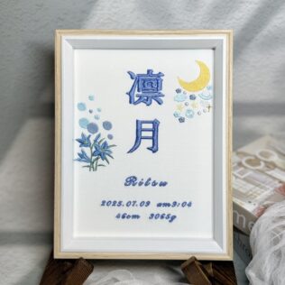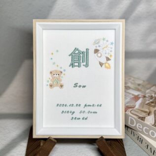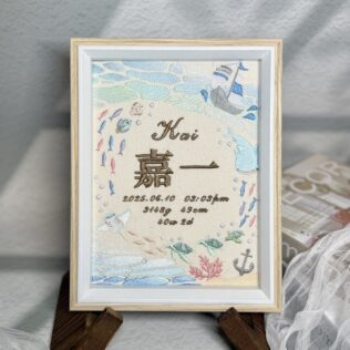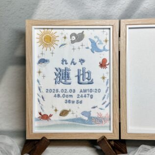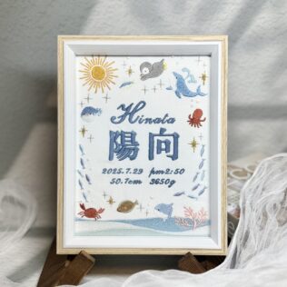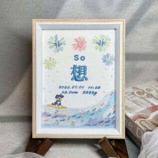 想くん、素敵なオーダーありがとうございました♪写真どんなオーダー内容?メニュー:デザイン自由な命名書 背面刺繍デザイン:夏らしく魚、音楽、愛犬のシュナウザーを入れておまかせ仕立て:額縁仕立て布色:ホワイト布使用した糸色は?名前:水色362番...