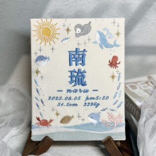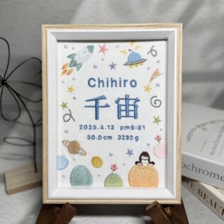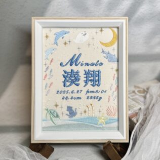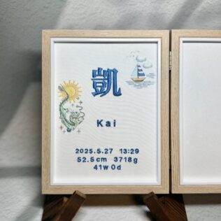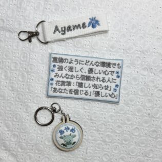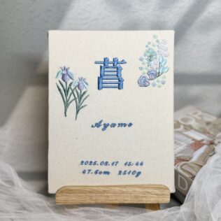 菖くん、素敵なオーダーありがとうございました♪写真オーダー内容と、使用した糸色は?メニュー:セミオーダー命名書デザイン:右上に小花組み合わせ、左下にアヤメ仕立て:布仕立て足あり布色:生成布使用した糸色は?名前:青74番キラキラ葉っぱ:緑27...